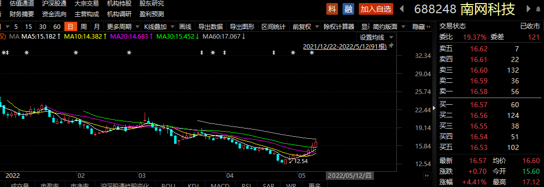 5月12日,南网科技报收16.57元/股,当日股价上涨4.41%,总市值93.57亿元。5月以来,南网科技股价上涨17.52%。一季度末,共有22只基金持有该股票,占流通股比例为12.2%。