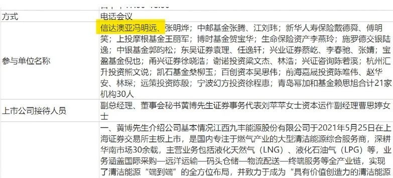 近期,信达澳亚冯明远现身调研九丰能源。