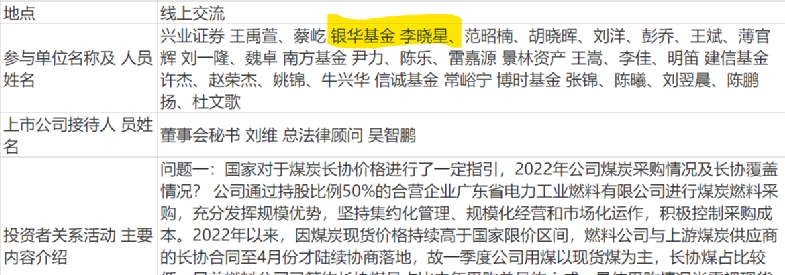 日前,上市公司粤电力被机构调研,银华基金李晓星现身其中。近半年数据显示,李晓星在管基金中,尚未持有该股票。