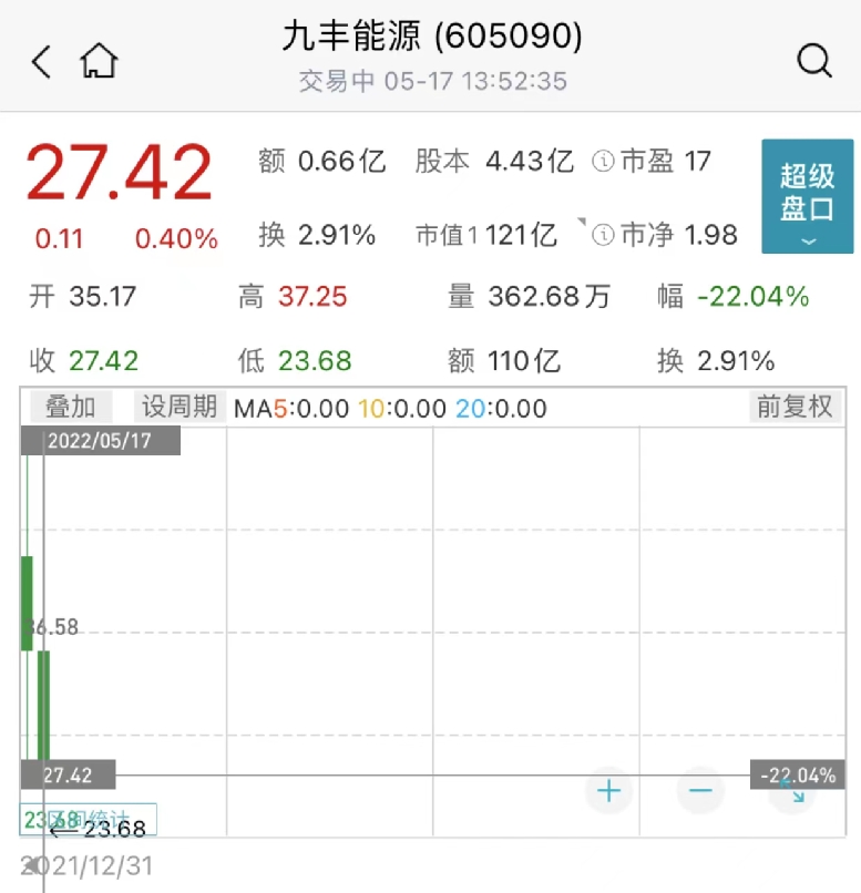 今年以来,九丰能源股价累计跌22%。
