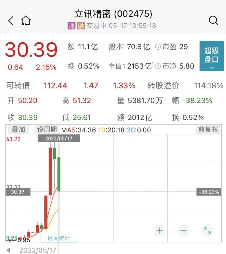 今年以来,立讯精密股价累计跌38%。