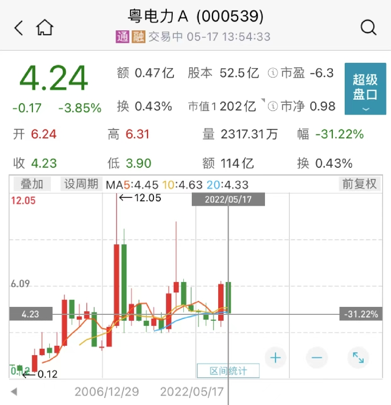 今年以来,粤电力A股价累计跌31%。