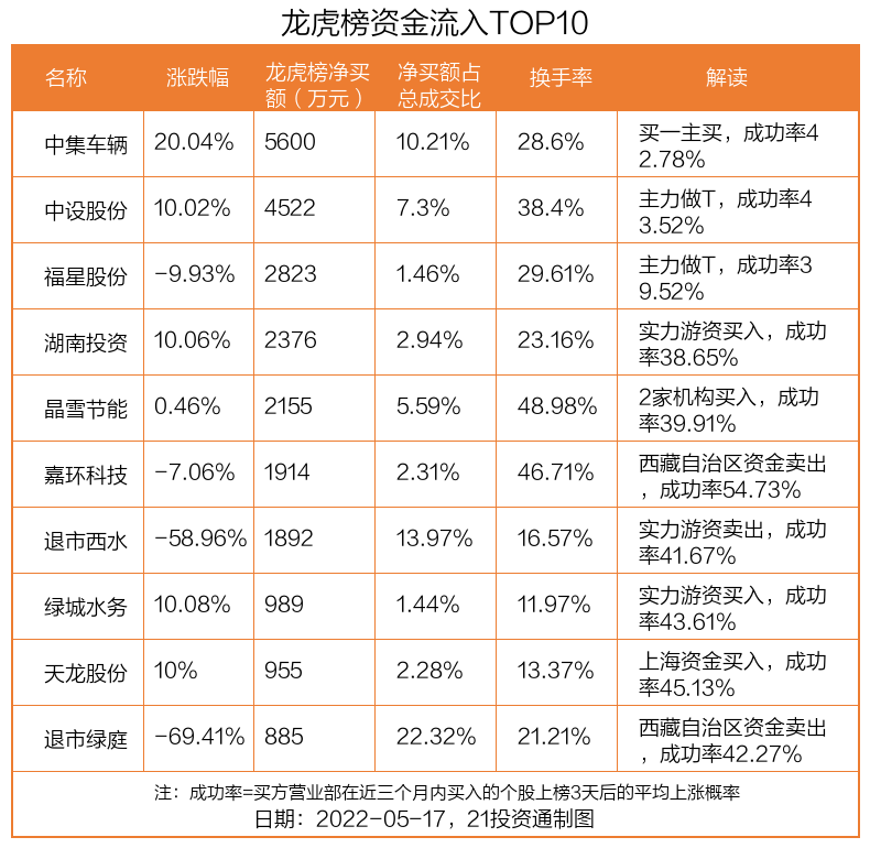 5月17日,上证指数上涨0.65%,深证成指上涨1.23%,创业板指上涨1.62%。盘后龙虎榜数据显示,共有53只个股因当日异动登上龙虎榜,资金净流入最多的是中集车辆(301039.SZ),达0.56亿元。
