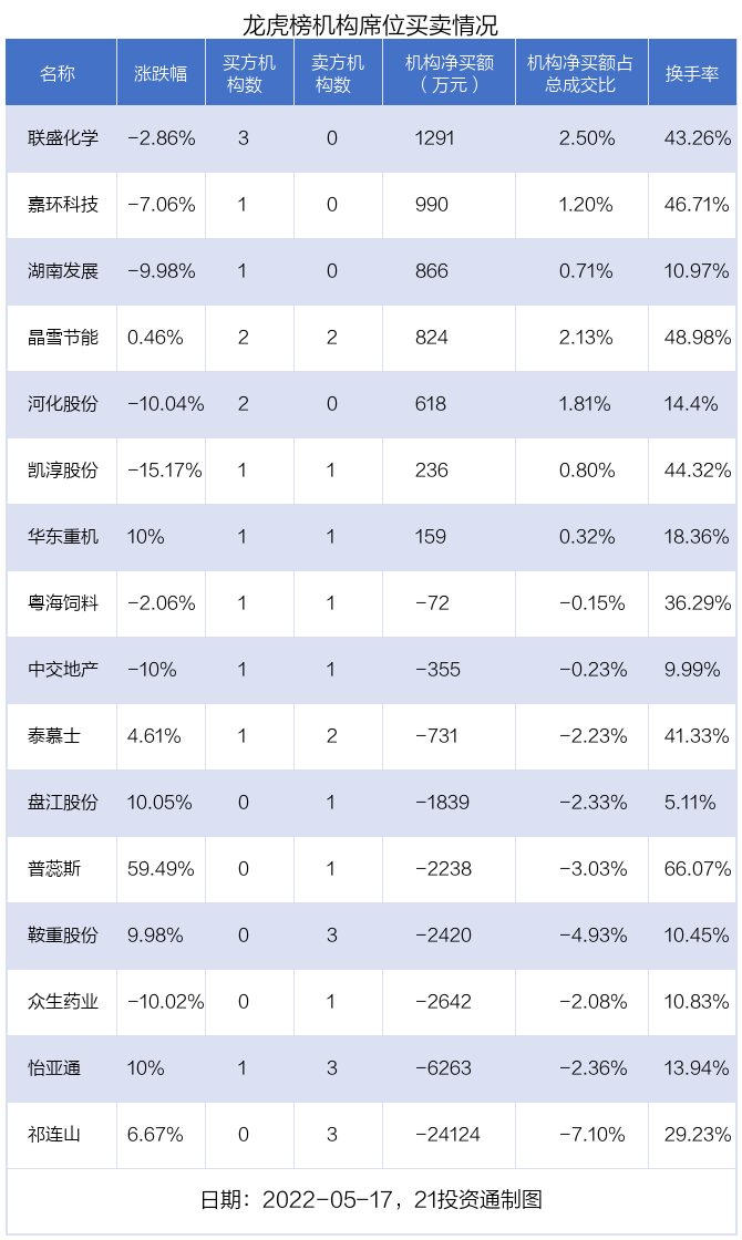 其中,机构净买入金额最多的是联盛化学(301212.SZ),当日收盘下跌2.86%,换手率为43.26%。前五大买卖营业部中有3家机构,为合计净买入1291万元,占总成交金额的2.50%。
