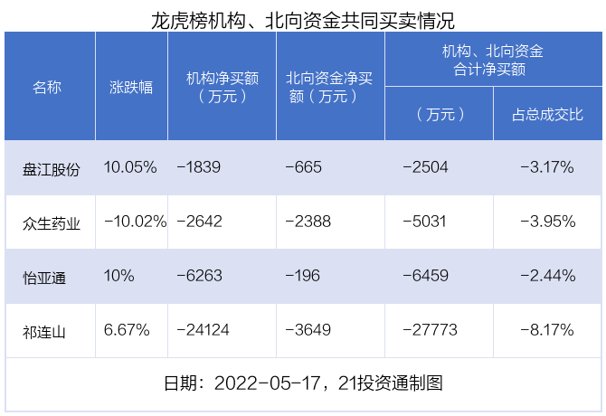 值得注意的是,机构和北向资金共同净卖出了怡亚通、盘江股份、众生药业、祁连山这4只股票。