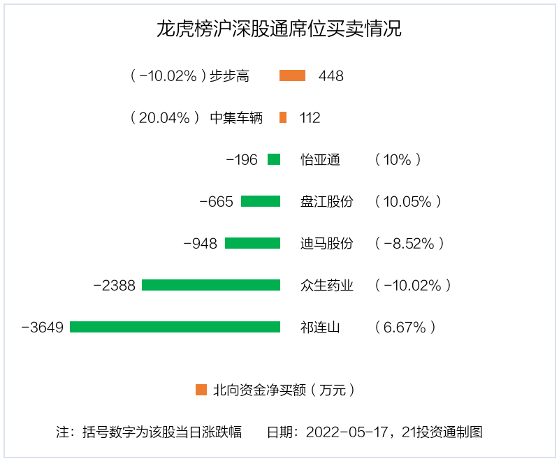 5月17日,北向资金参与龙虎榜中的个股共有7只,合计净卖出7285.63万元。其中沪股通净卖出3 股,合计净卖出5262.19万元;深股通净买入2 股,净卖出2 股,合计净卖出2023.45万元。