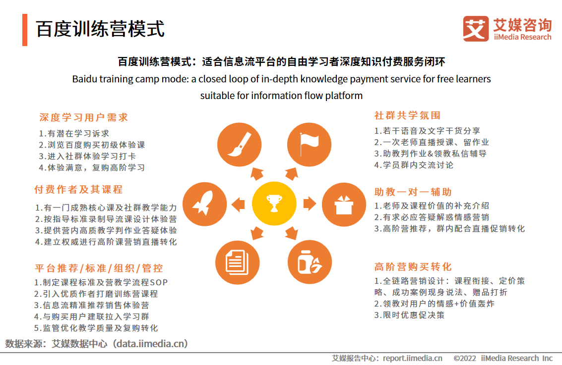 为了解决知识付费创作者公域流量转化为私域流量的诉求,并提升公域流量的利用效益,百家号付费专栏在2021年8月推出新型知识付费工具“训练营”,其商业模式,即通过辅导百家号作者打造具备较高营销价值的低价体验营,在百度APP主页推荐分发,购买用户进入特定粉丝群后,接受作者增值培训和深度服务。