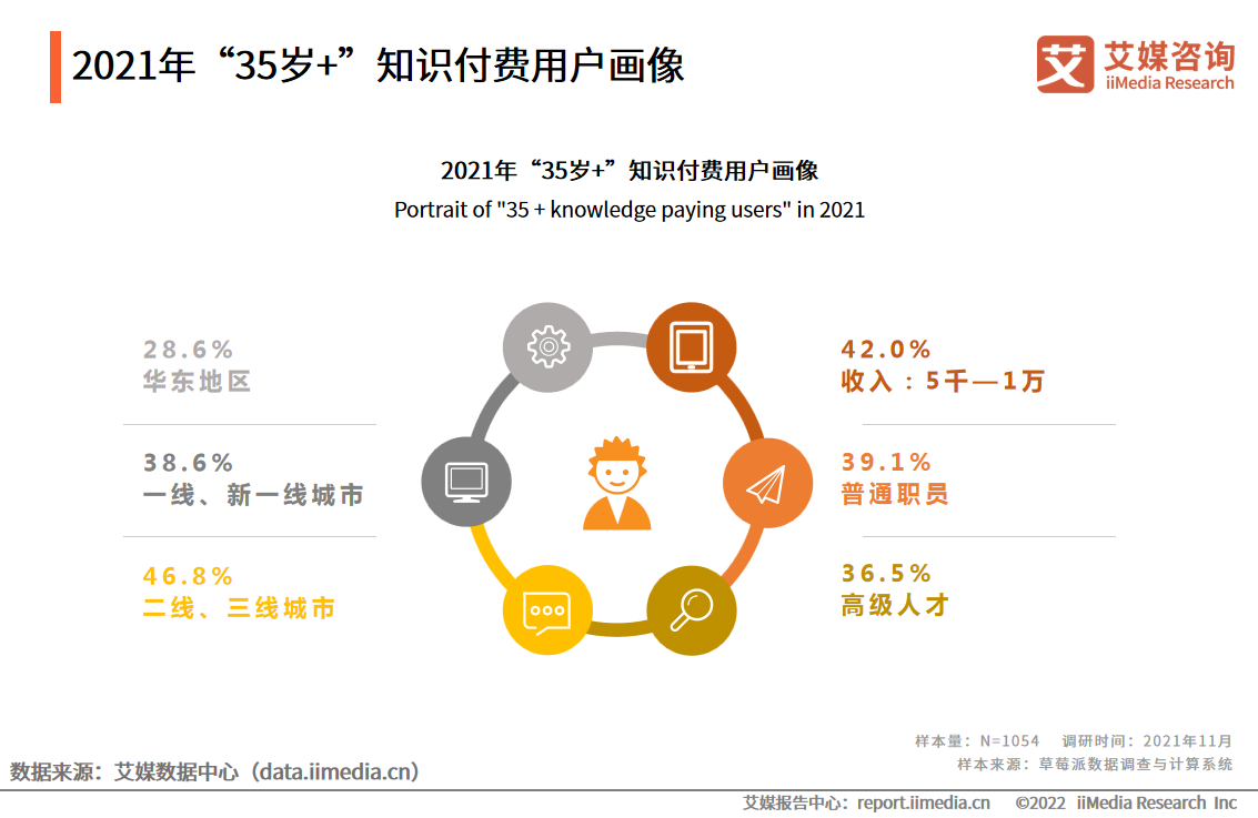 iiMedia Research(艾媒咨询)调研数据显示,使用知识付费产品的“35岁+”用户主要集中在一线和二线城市,大多都是普通职员、企业管理者和专业人员。该类人群文化素养和收入水平较高,心智审美相对成熟、具备一定消费能力,对真正有价值且能丰富内心的内容付费意愿较强。