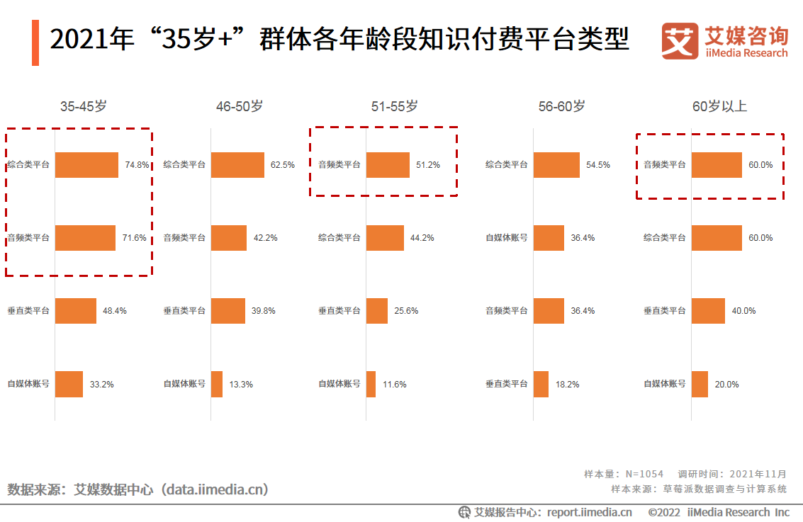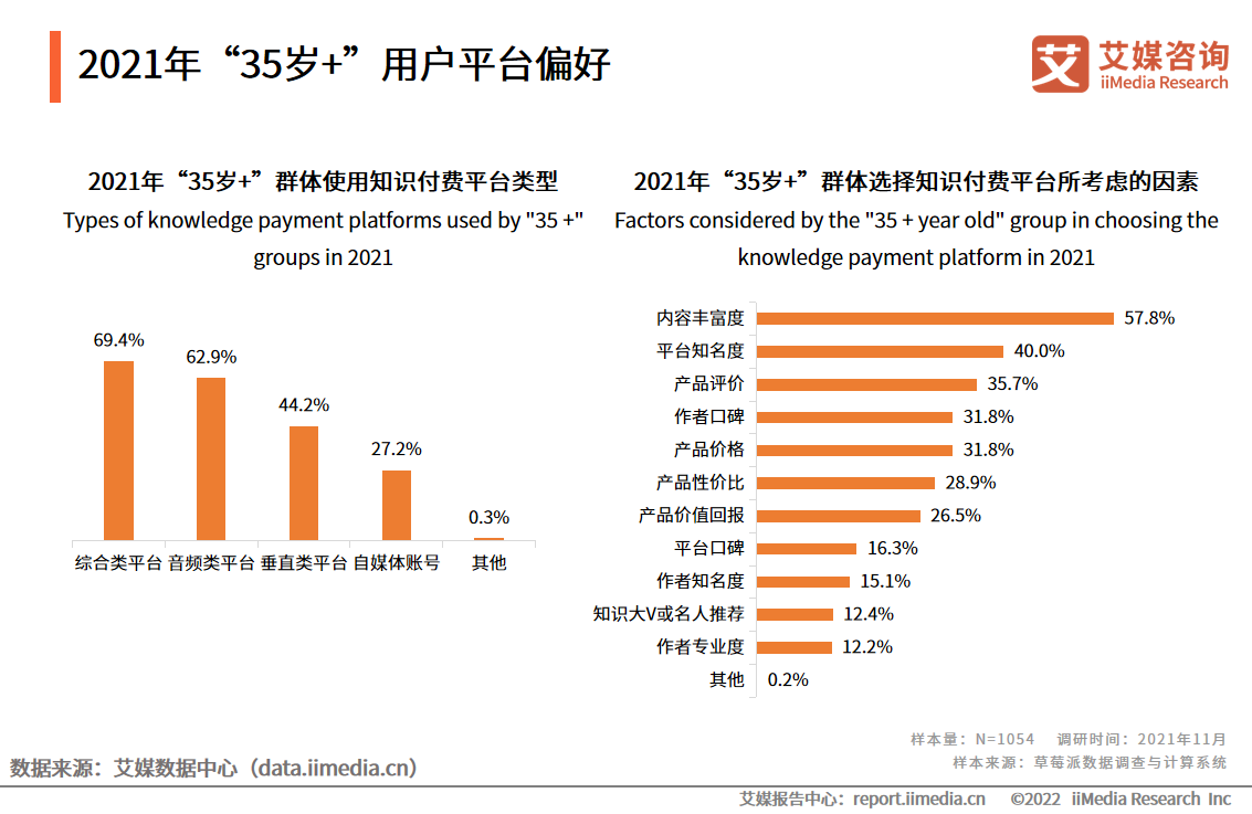 iiMedia Research(艾媒咨询)调研数据显示,2021年“35岁+”群体选取综合类平台用户占比最多,占调研用户近七成。“35岁+”群体更偏向内容丰富和知名度高的平台,综合类知识付费平台已逐渐成为“35岁+”群体的主流选择。