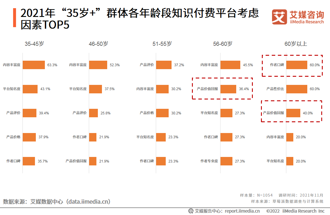 考虑因素方面,内容丰富度与平台知名度是“35岁+”各个年龄段的关注因素,50岁以上的用户更关注产品价值回报和作者口碑。