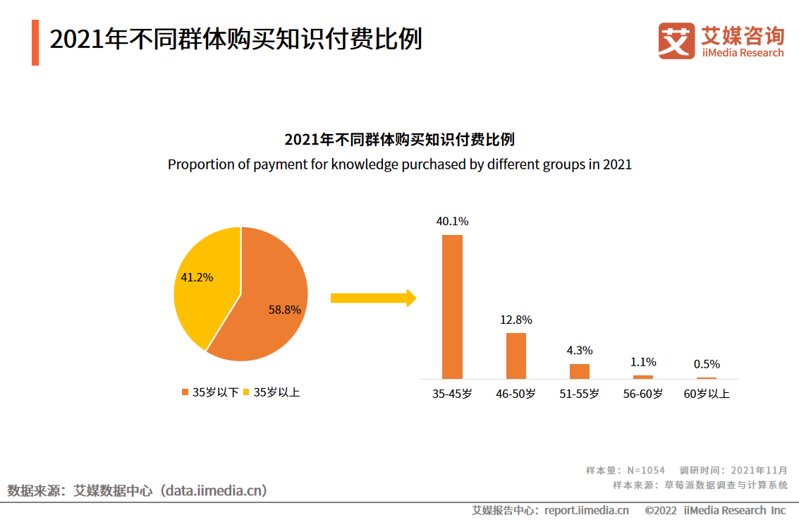 过往研究中较少关注的知识付费用户群体开始受到瞩目,尤其在“35岁+”群体的网络需求崛起后,他们对知识付费内容的偏好和消费能力的凸显正对知识付费行业产生深刻影响。iiMedia Research(艾媒咨询)调研数据显示,2021年“35岁+”群体购买知识付费的比例达到58.8%,其中主要购买者年龄范围为35-45岁。