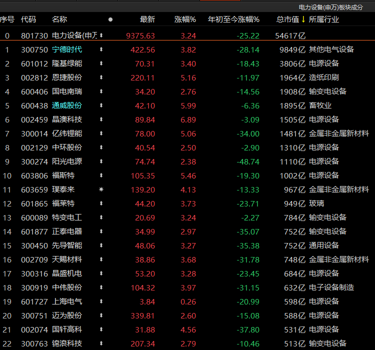 电力设备板块今日领涨,近期大幅反弹,年内跌幅缩至25.22%。相关个股来看,18只个股涨幅超过5%,其中清源股份等6只个股涨停。就市值超过1000亿元的10只相关个股而言,最高涨幅近7%,最低超过2%。宁德时代今日上涨3.82%报422.56元/股,最新市值为9849亿元,年内跌幅缩近28%。