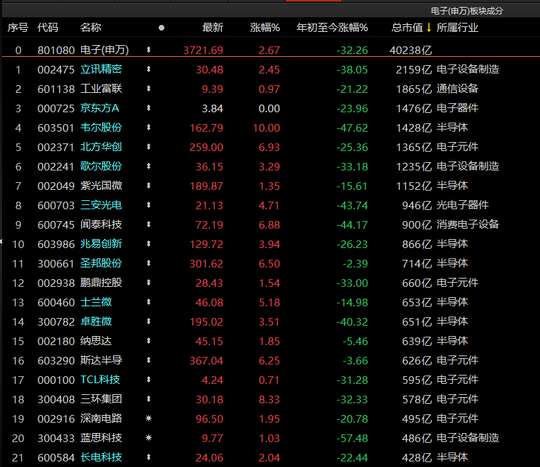 年内回调明显的电子板块近日反弹较大,今日收涨2.67%,7只个股涨停,年内累计跌幅收窄至32.26%,但跌幅仍居前。板块中的“大哥”立讯精密今日收涨2.45%报30.48元/股,年内跌幅约38%。韦尔股份涨停报162.79元/股,年内跌幅收缩至近48%。北方华创今日涨近7%报259元/股,年内跌幅仍超过25%。