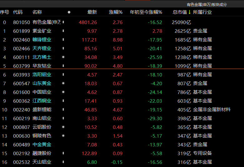 有色金属板块也抬头,年内跌幅缩至近17%。紫金矿业今日收涨2.78%报9.97元/股,赣锋锂业大涨近9%报117.21元/股,年内跌幅缩至近18%。天齐锂业涨约5%,表现也不错,年内跌幅缩至约20%。