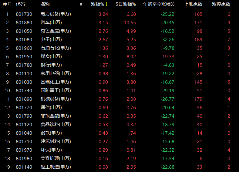 板块上涨居多,电力设备、汽车、有色金属、电子板块今日涨幅均约3%,这些板块年内跌幅靠前,近期回暖幅度较大。