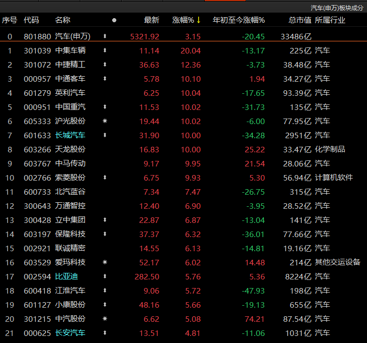 汽车板块中,171只个股收涨,9只个股涨停,中集车辆大涨20.04%。市值超过1000亿元的4只个股中,“大哥”比亚迪今日收涨5.76%报282.5元/股,年内累计涨幅超过5%,最新市值为8224亿元;上汽集团今日涨约2%,长城汽车涨停,广汽集团、长安汽车涨势也较好。