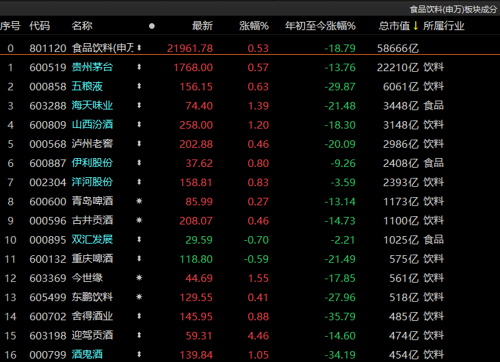 消费类板块今日表现一般,食品饮料板块微涨,贵州茅台、五粮液涨幅均不超过1%,海天味业、伊利股份也收涨。