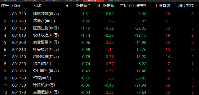 建筑装饰、房地产、医药生物、农林牧渔板块今日跌幅超过1%。