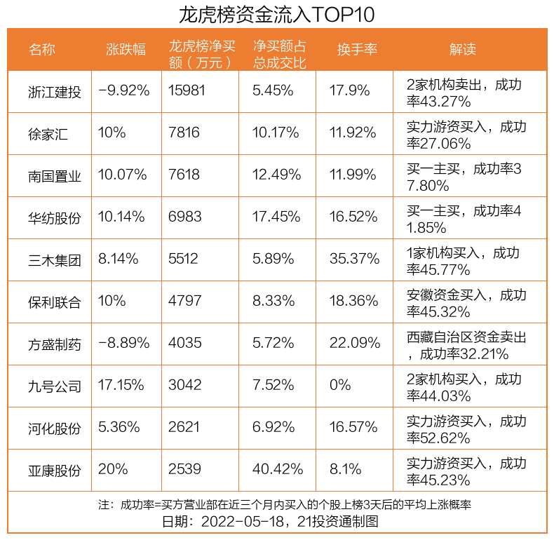 5月18日,上证指数下跌0.25%,深证成指下跌0.2%,创业板指下跌0.16%。盘后龙虎榜数据显示,共有56只个股因当日异动登上龙虎榜,资金净流入最多的是浙江建投(002761.SZ),达1.6亿元。