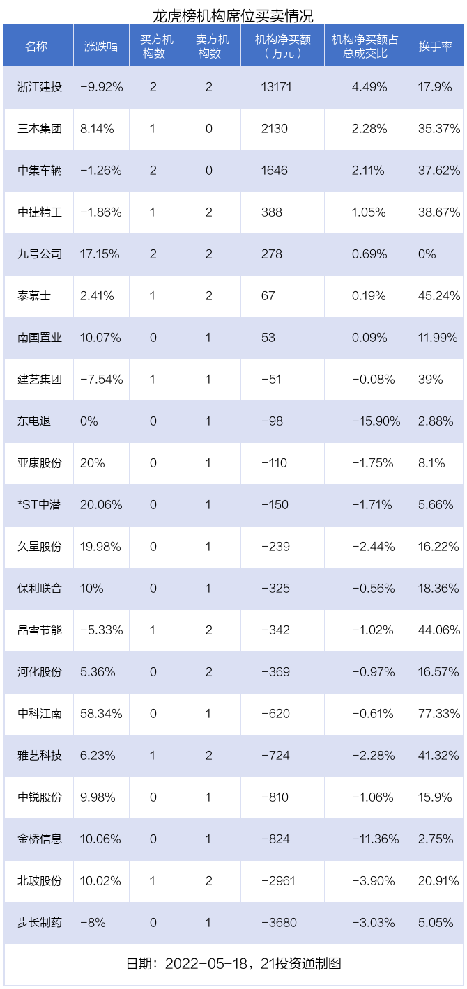 5月18日,21只个股龙虎榜出现了机构的身影,机构合计净买入6431.8万元。具体来看,机构净买入7股,净卖出14股。