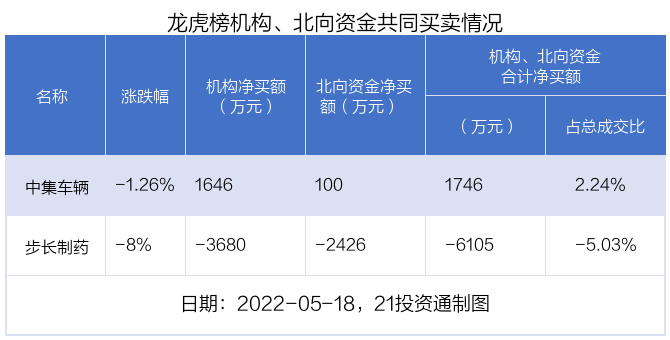 值得注意的是,机构和北向资金共同净买入了中集车辆;共同净卖出了步长制药。