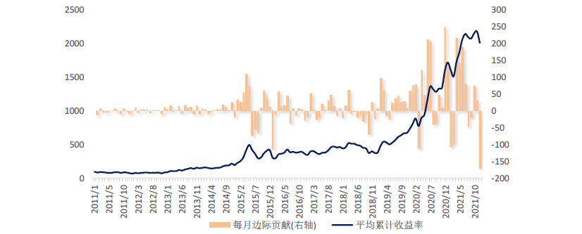 如果我们在2011年初,以等权重持有所有纳入统计的十年十倍股。