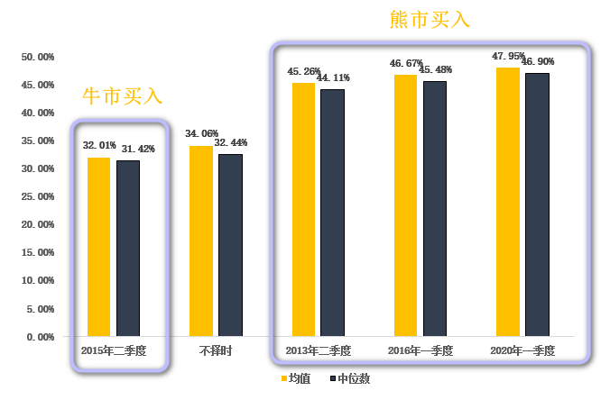 2015年牛市高点买入,十年十倍股年化收益均值为32.01%;不择时的年化收益率均值为34.06%。