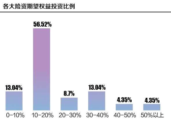 在具体问及保险资管机构在未来几年对权益投资的预期情况时,有69.56%的从业者表示,权益投资未来可能会占总投资规模的20%以下。其中56.52%的投资认为,会在10%-20%的区间内。只有极少数从业者认为,其所在保险资管机构对权益投资的占比将会达到40%以上。