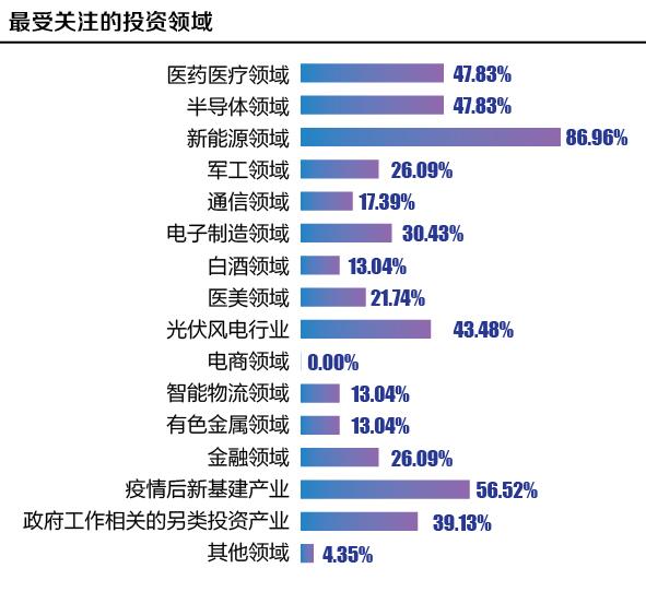在低利率时代下,大多数保险公司目前仍以货币类投资为主。在对受访者未来最关注的投资方向的统计中,新能源领域高居榜首,成为保险资管公司最关注的投资方向,疫情后的新基建产业、医药医疗、半导体领域紧随其后。