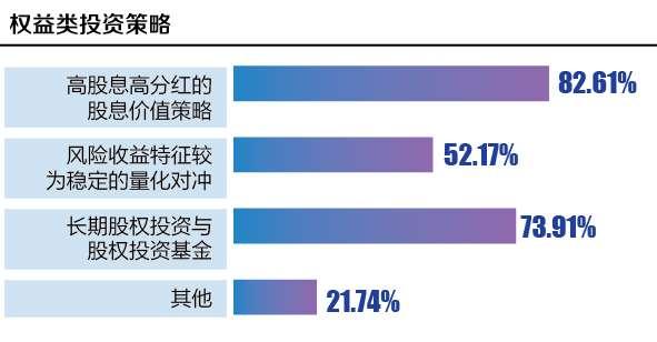 在权益类投资的策略上,绝大多数保险资管机构选择高股息、高分红的股息价值策略,占问卷调查机构的82.61%;选择长期期权投资和期权投资基金也不少,占比73.91%;两者兼具的保险公司占多数。另外也有过半数的企业会兼具风险收益特征较为稳定的量化对冲。