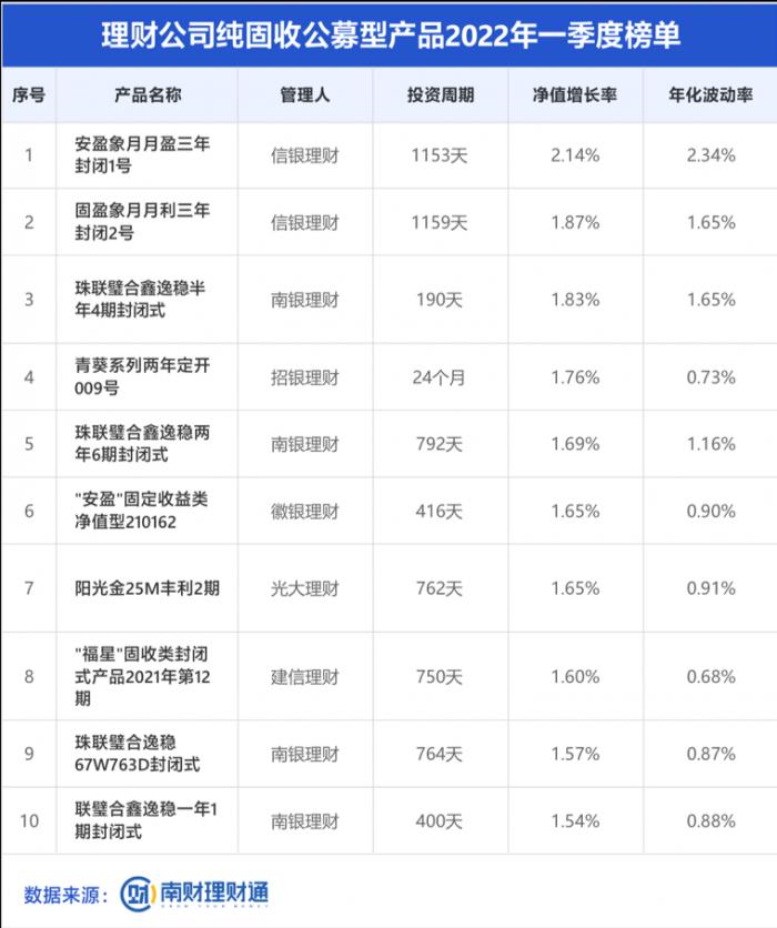 从2022年第一季度纯固收产品收益排行榜来看,有6家理财公司的产品进入榜单前十,分别是信银理财、南银理财、招银理财、徽银理财、光大理财和建信理财。