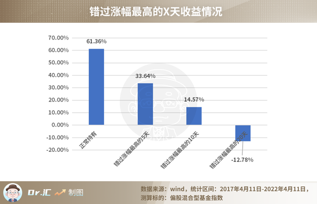 以偏股混合基金指数为例,过去5年,择时和不择时的收益差距很大。与正常持有相比,错过涨幅最高的5天,收益缩水近一半;错过涨幅最高的10天,收益只剩下14.57%;错过涨幅最高的20天,不仅没有盈利,反而亏损12.78%。