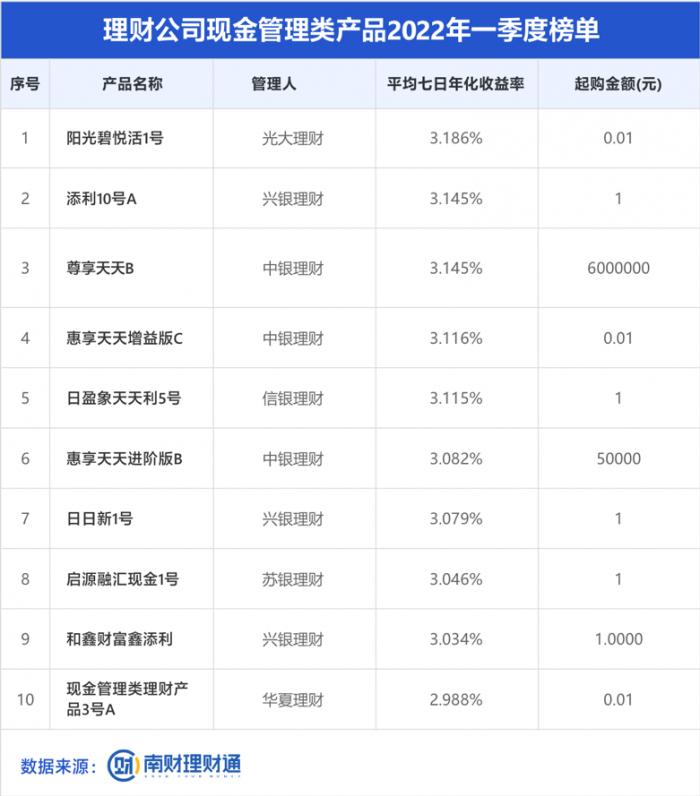 从南财理财通2022年一季度银行理财公司现金管理类产品七日年化收益率均值来看,光大理财“阳光碧悦活1号”以七日年化收益率均值3.186%占据榜单首位。上榜产品七日年化收益率均值差距较小,榜首与榜尾收益差距仅0.198%,收益竞争较为激烈。