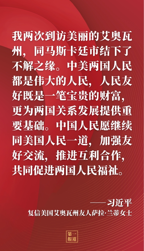 近日,国家主席习近平复信美国艾奥瓦州友人萨拉·兰蒂女士,鼓励兰蒂女士和艾奥瓦州老朋友们继续撒播友好的种子,为中美两国人民友好作出新的贡献。