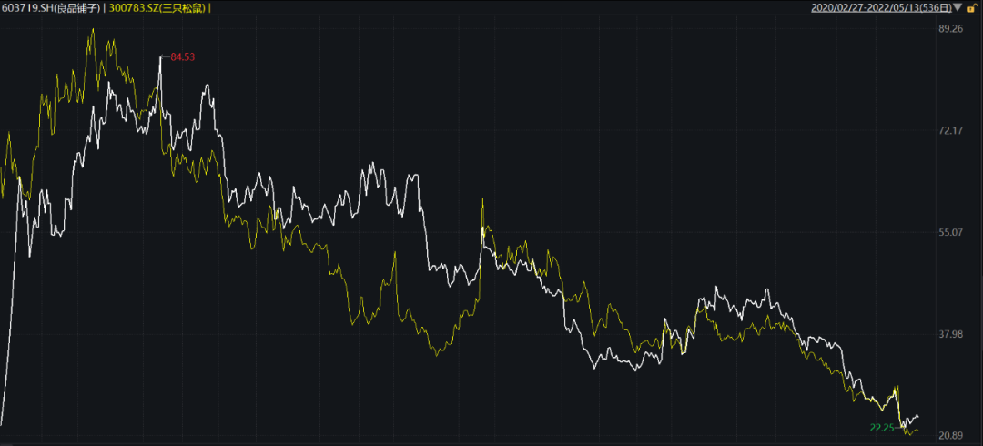 三只松鼠VS良品铺子股价走势 图源:Wind