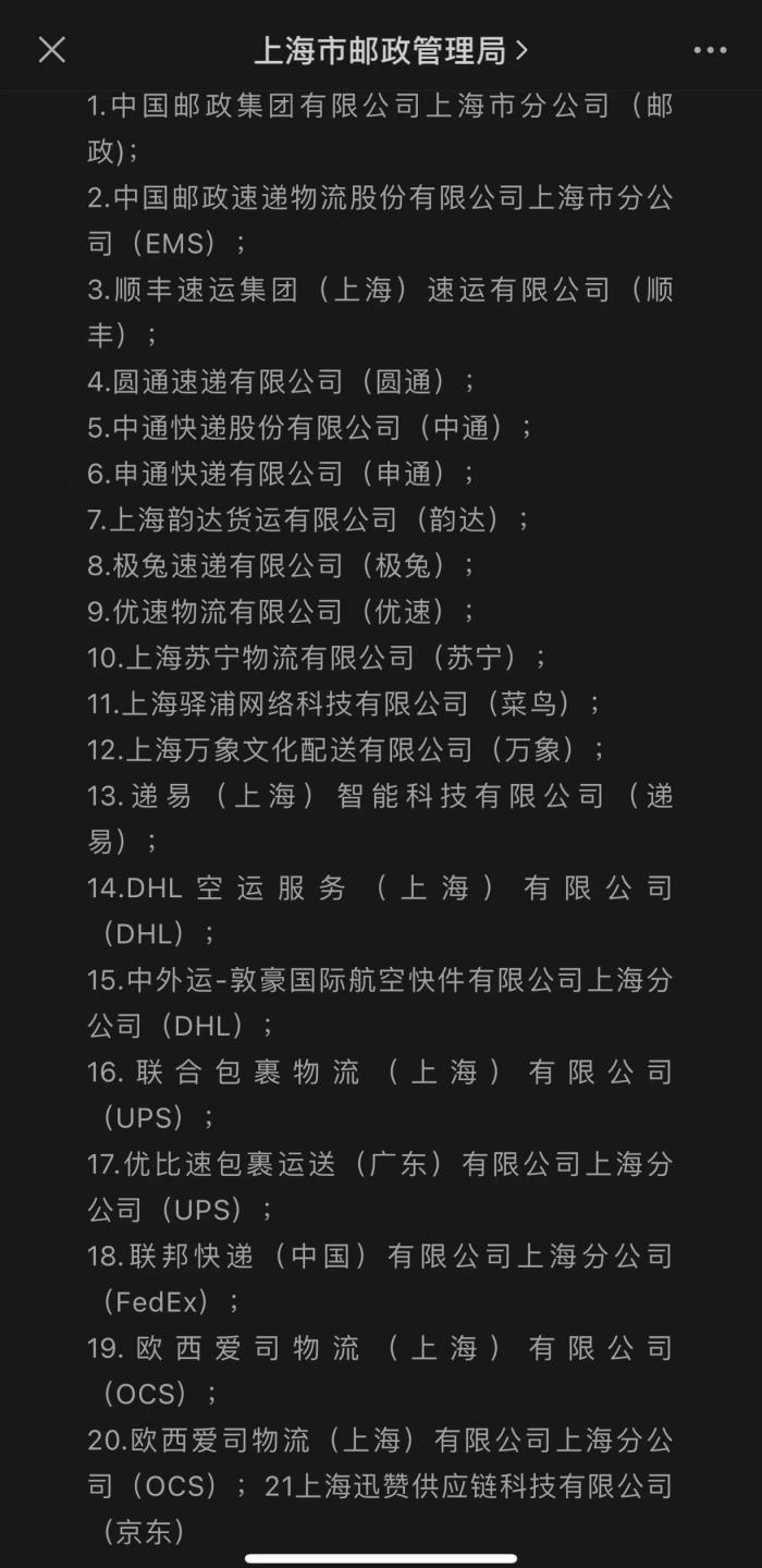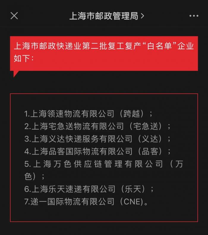 直到5月8日,上海市邮政管理局发布“上海邮政快递业第一批复工复产‘白名单’企业”,中国邮政、顺丰、“三通一达”等21家快递公司榜上有名。