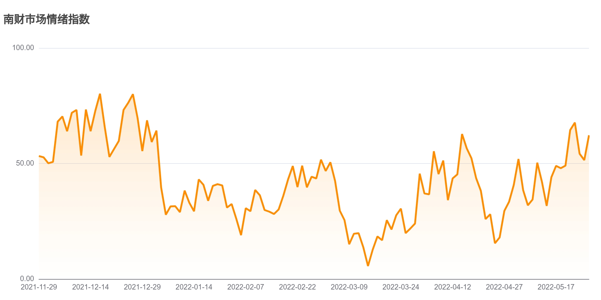 今日南财市场情绪指数为62.2,较前日51.5大幅上涨,市场投资热度明显提升。A股市场的行为是非常情绪化的,当市场上涨时,投资者趋于贪婪,产生追涨情绪;当市场下跌时,往往会失去理智急于出售他们的资产。为量化投资者当前对购买股票的情绪程度,基于中国波指(iVIX)与CNN恐慌贪婪指数,南财量化团队挑选出五大指标,综合加权得到了南财情绪指数。南财情绪指数范围从0-100,越低表明市场投资热度较低,越高表明市场投资热度较高。南财情绪指数有助于市场参与者更好地认识和分析股票市场的波动风险和跳跃风险,市场投资热度偏低表明投资者过于担心,如果当前市场定价并不高,这可能是一个买入机会。市场投资热度偏高则表明投资者过于兴奋,如果市场处于高位,市场可能会进行调整。南财情绪指数的发布,不仅有利于投资者进行更佳的风险管理,也为维持金融市场的稳定繁荣提供了有效的参考依据。