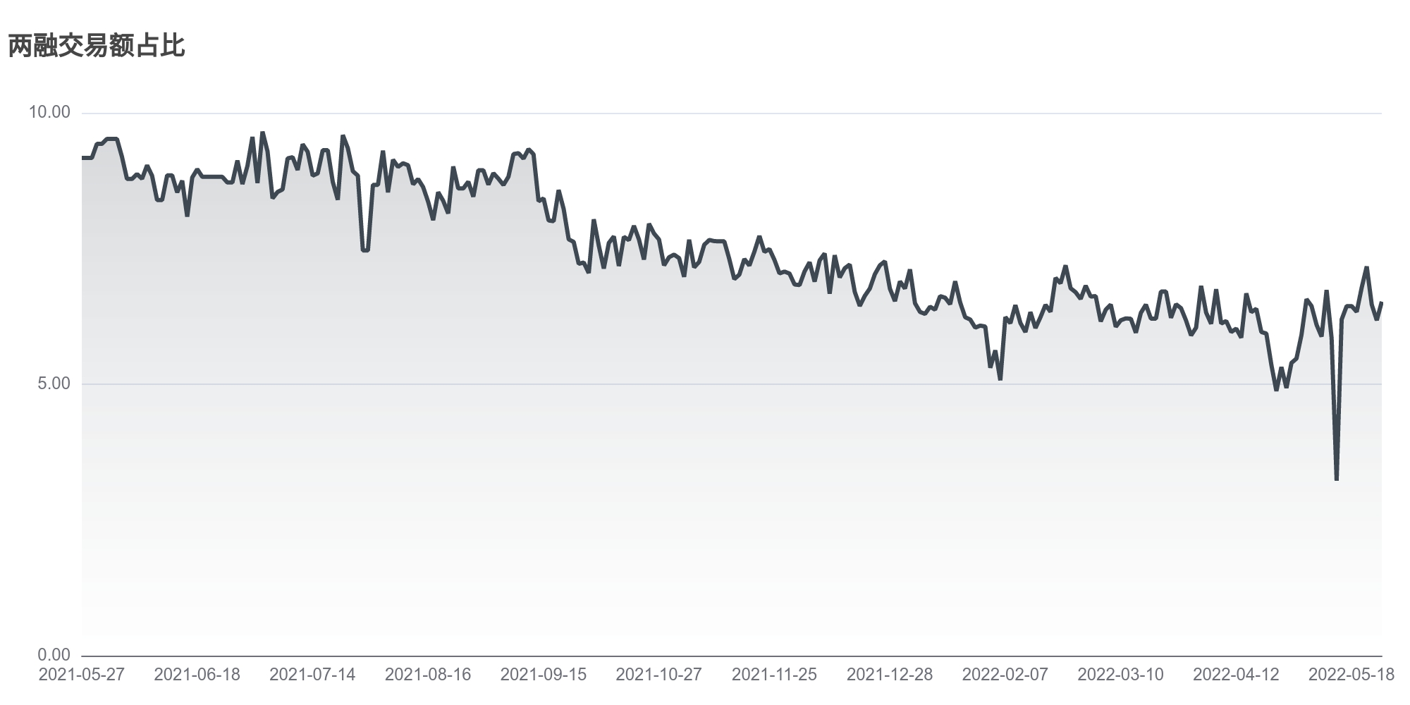 今日该指标值为6.52%,目前该指标处于近一年较低区间,说明投资者认为A股市场趋于触底反弹。反映场内投资者借钱炒股的杠杆水平,该指标越高说明杠杆水平越高,即投资者认为当前市场较强,反之则说明投资者认为市场相对较弱,因而与上证指数存在较强的正相关性。