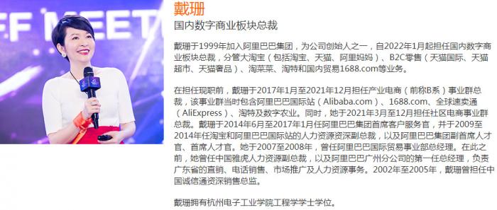 去年底,阿里调整高层架构。“18罗汉”之一的戴珊接替蒋凡,为新成立的中国数字商业板块负责人,统管大淘宝(淘宝、天猫、阿里妈妈)、B2C 零售(天猫国际、天猫超市、天猫奢品)、淘菜菜、淘特和 1688 等业务。
