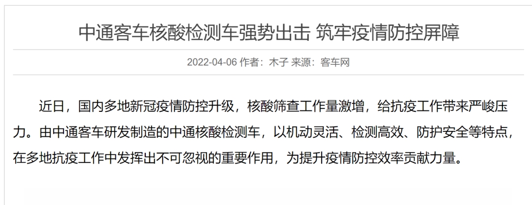 事实上,早在今年4月,就有媒体发布“中通客车核酸检测车强势出击 筑牢疫情防控屏障”一文,并被公司官网转载。