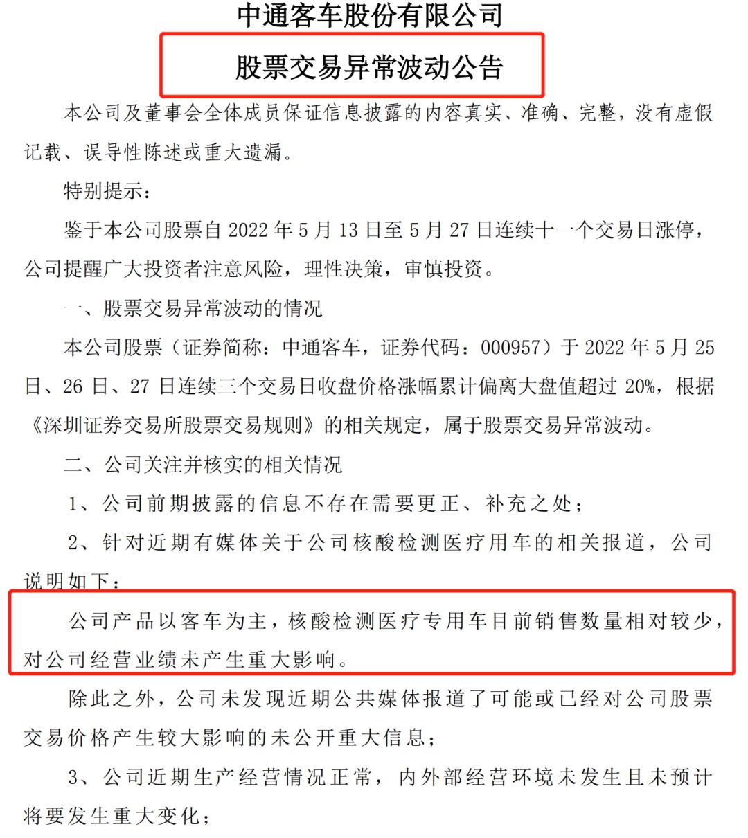 5月29日晚间,在收到深交所关注函并被重点监控后,11连板“核酸检测车”概念股中通客车(000957)终于首次在股价异动公告中官宣:核酸检测医疗专用车目前销量相对较少,对经营业绩未产生重大影响。