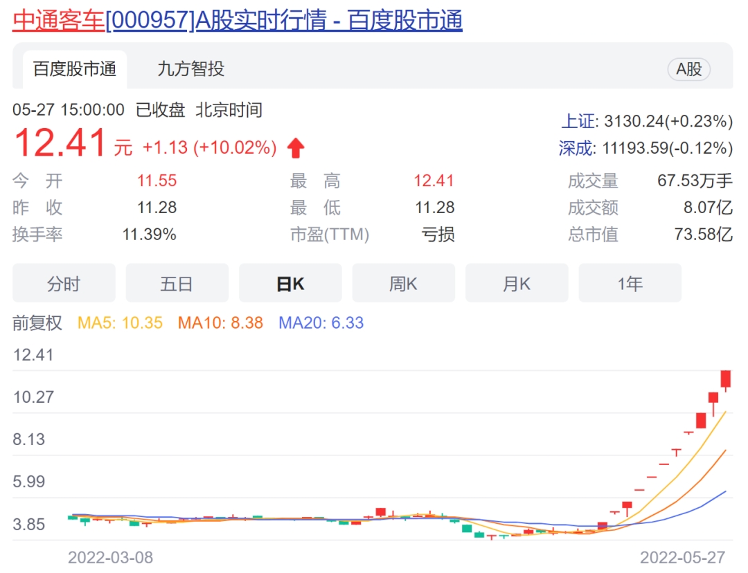 5月13日以来,中通客车开启连续涨停模式,仅用11个交易日便收获了高达186%的涨幅,截至5月27日收盘股价已攀升至12.41元/股,市值达74亿元。