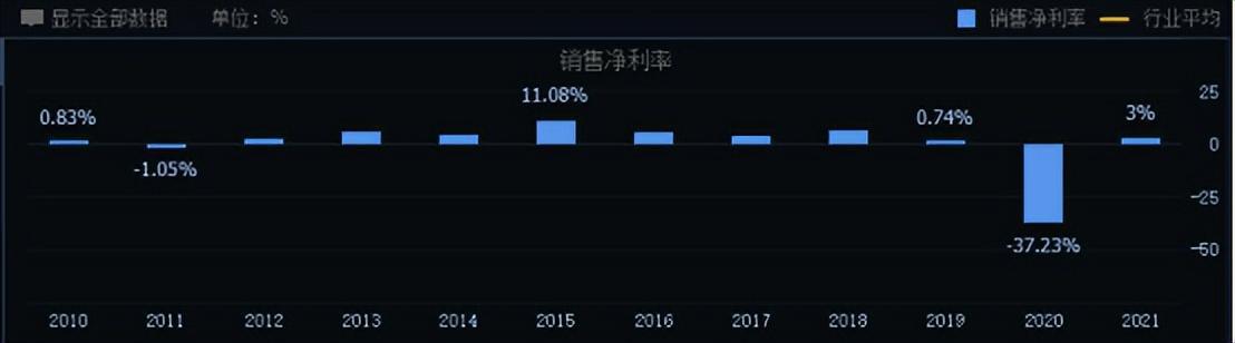 2010年以来,中成股份有7年出现归母净利润下滑情况,其中2011年、2020年分别亏损1100.37万元、2.76亿元。因净利数据不稳定,导致销售净利率波动大,2020年公司销售净利率最低跌至-37.23%,去年回升至3%。