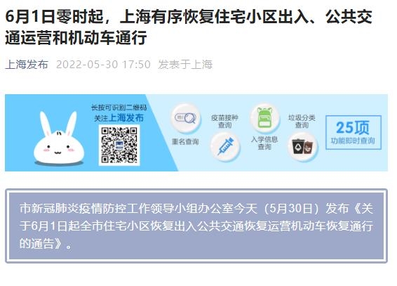 上海市新冠肺炎疫情防控工作领导小组办公室今天(5月30日)发布《关于6月1日起全市住宅小区恢复出入公共交通恢复运营机动车恢复通行的通告》。