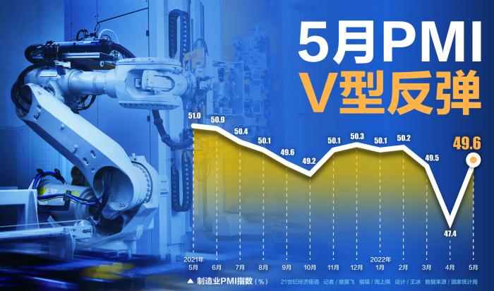 统计局数据显示,5月份制造业PMI在4月份较低基数水平上回升至49.6%。生产指数和新订单指数分别为49.7%和48.2%,比上月回升5.3和5.6个百分点。