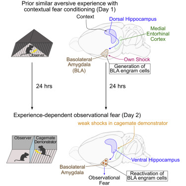 具体来说,背腹侧海马区(dorsoventral hippocampus,dvHPC)到BLA的通路是始作俑者。背侧HPC神经元在之前的恐惧体验中产生BLA中的恐惧记忆印迹细胞,而腹侧HPC神经元对熟悉的演示者的恐惧情境做出反应,重新激活BLA中的恐惧记忆印迹细胞以引出Exp OF。