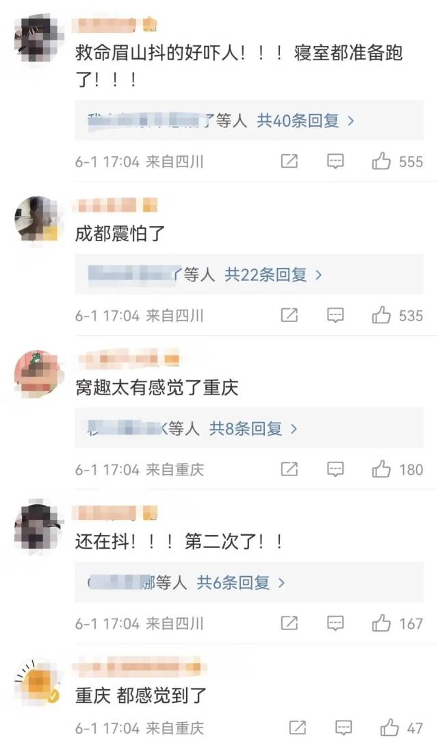 “成都震感太强了!”多位成都重庆等地网友表示,地震后晃了好几次。@资阳消防、@自贡公安也在微博上分别表示,四川资阳、自贡震感强烈,愿平安。