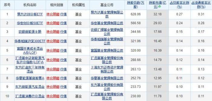 其中,易方达创业板ETF目前持有宁德时代居首,持有市值达32.18亿元;华安创业板50ETF持有29亿元紧随其后,农银新能源主题、华泰柏瑞沪深300ETF、富国天惠成长混合A/B(LOF)等持股市值均超过16亿元。