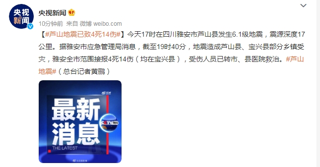 6月1日17时,四川雅安市芦山县发生6.1级地震,震源深度17千米。截至19时40分,地震造成芦山县、宝兴县部分乡镇受灾,雅安全市范围接报4死14伤(均在宝兴县),受伤人员已转市、县医院救治。