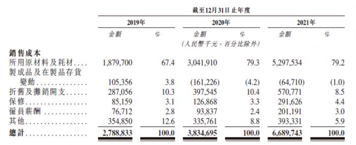 同期,威马的原材料及耗材成本逐年增长,分别为18.8亿、30.4亿和53.0亿元,占当期销售成本的比重,由67.4%涨到79.2%。